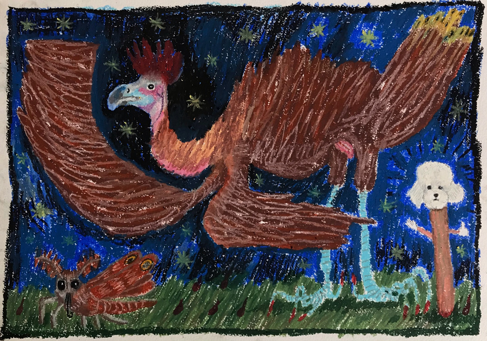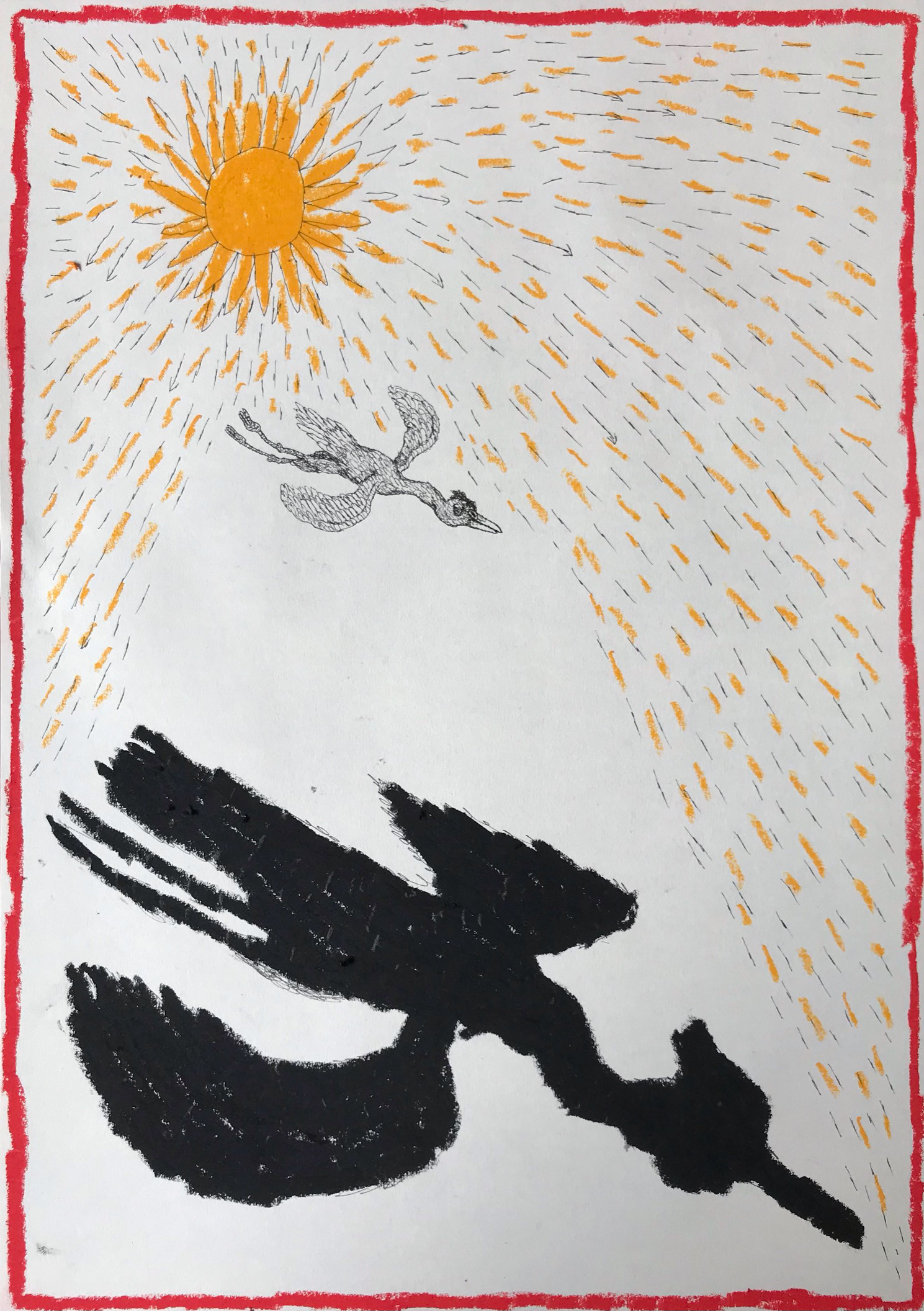 sisteminha de passaralho / projeção e negação e emissão e particulosidade suprema / presença e vulto e massa, 2021, pastel oleoso e nanquim sobre papel, 40 x 30 cm