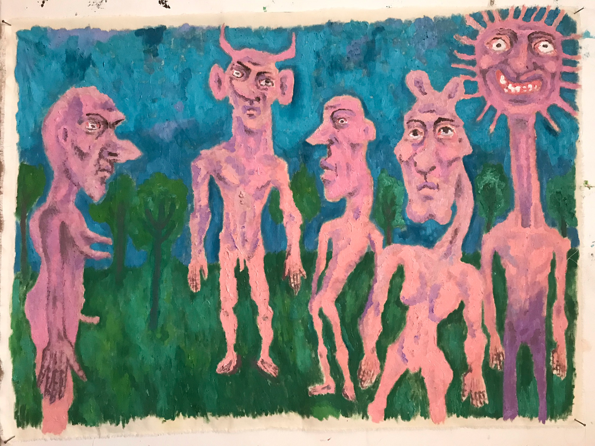 bestiário / família andarilha / gangue nômade / laboratório onde nasce e onde se gera / terra onde brota e por onde se perambula / trajeto / fenômeno e busca / calor de grupo (ORIGEM) (ELO PERDIDO), 2021, óleo sobre tela, 50 x 70 cm