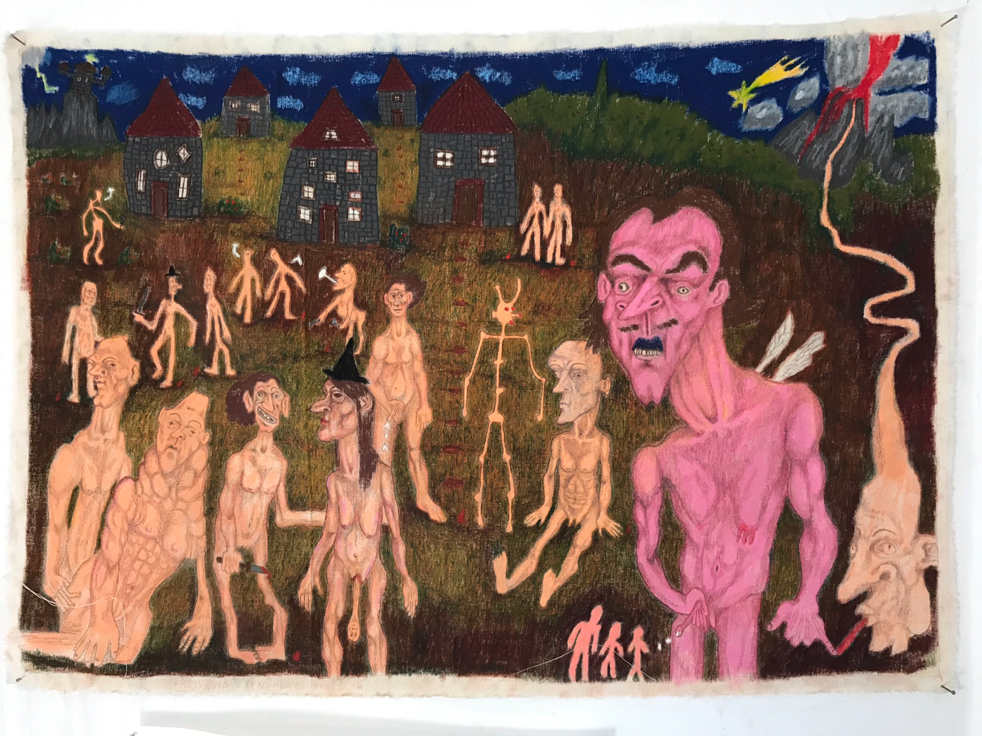cortejo / demarcação de terra / fundação de vilarejo / ritual de acasalamento / carnaval / milagre da multiplicação, 2021, pastel oleoso sobre algodão cru, 75 x 45 cm